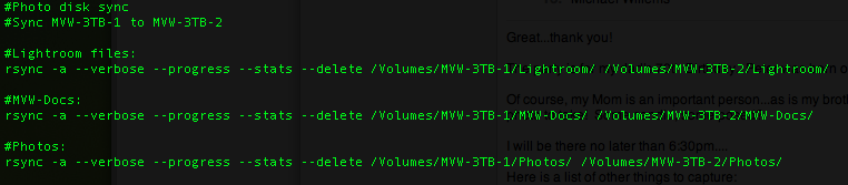 rsync -a –verbose –progress –stats –delete /Volumes/MVW-3TB-1/Photos/ /Volumes/MVW-3TB-2/Photos/