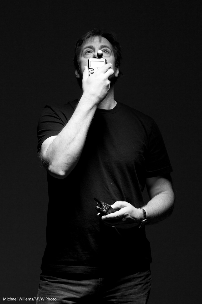 We used one small beauty dish. Straight above Joseph. And the white studio walls, because they got no light, turned dark. This is key: umbrellas would have spilled light onto the background. This small directional light allowed the background to remain dark.