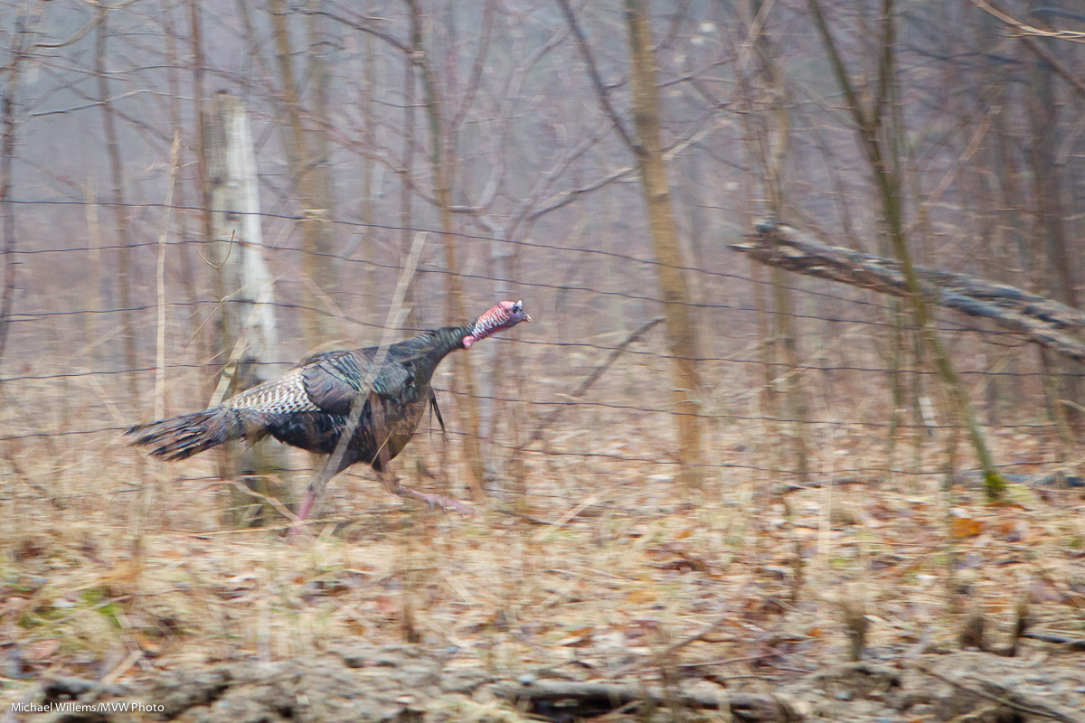 He is trying to get away from my car, but the fence prevents this. He runs and runs but the fence never ends. Brains are not the strongest suit for these birds, apparently. His girlfriends, incidentally, did run the right way, and they got away much more easily.