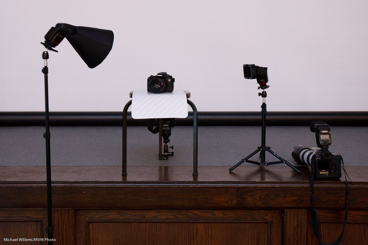 THREE. Add a main light. For this, use a flash with a modifier. I used a Honl Photo softbox in yesterday’s Three Minute Shot. Put this on a light stand, close to the product (close means larger, hence softer; it also means less light falls onto the background. This is important if you want to color it or leave it dark.)