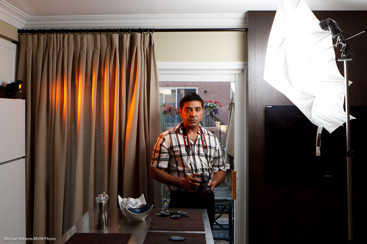 - First, add a main light, diffused – in my case through an umbrella, on our right. Measure that, and ensure its brightness is good.