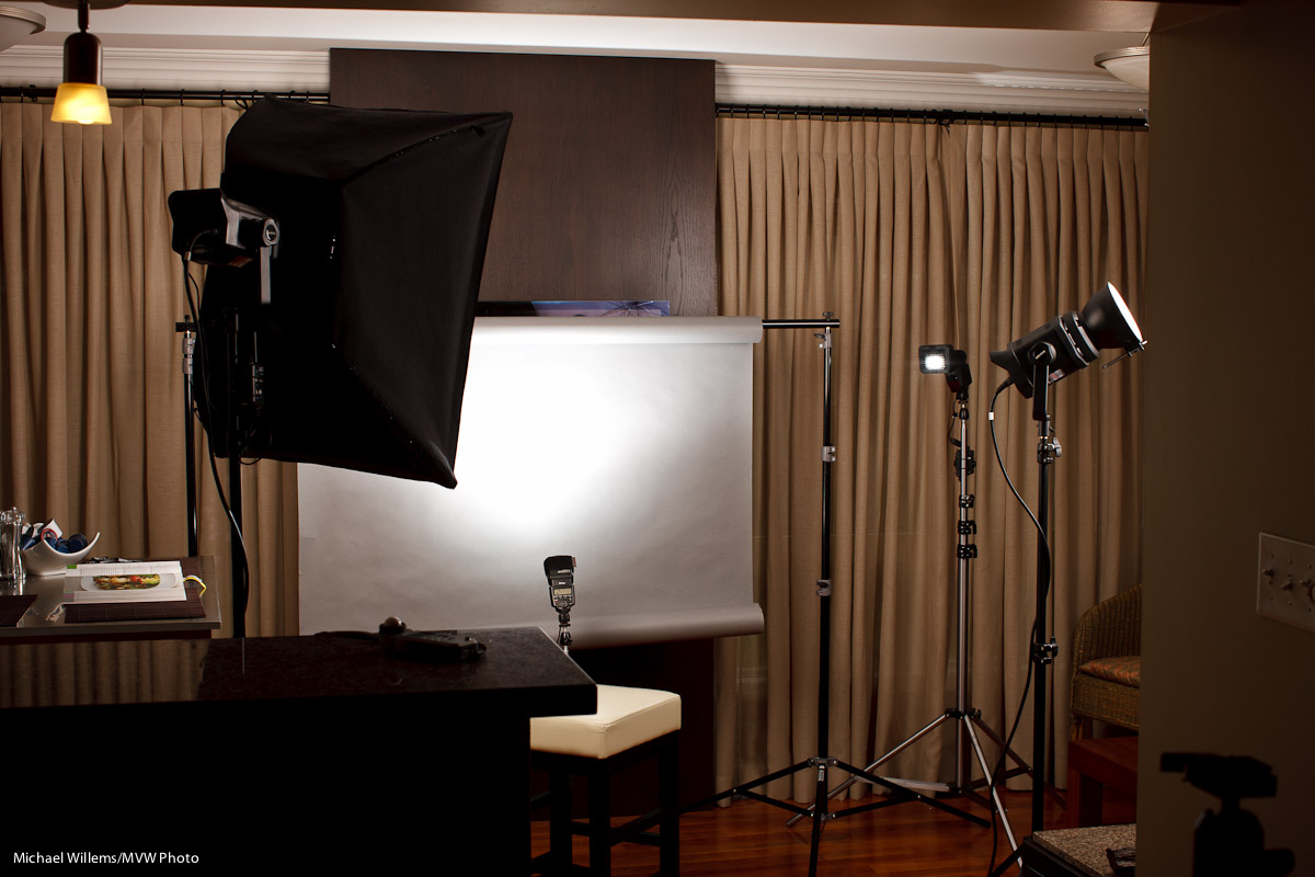 Here’s a recent portrait setup: I used two strobes here, and two speedlights (for space reasons).