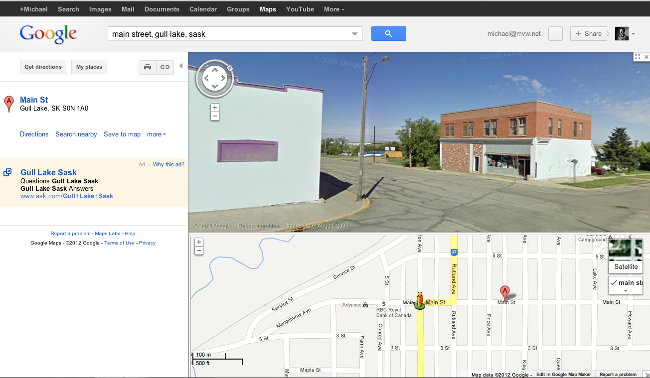 The cool thing about Google is that it shows the red brick building is a bank and the building on the left belongs to the Elks and is still in good shape and maintained. The view is the edge of town looking away from town, Google lets you tour Main St. to see it is mostly houses but they look maintained. So the original view is stark but if you follow someone’s suggestion and turn around, you see a less stark view as you are looking into town.