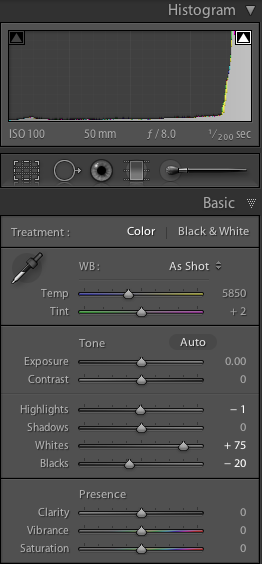 But there is a way to get back my overexposure: turn up “whites” in the Develop Module’s Basic pane: