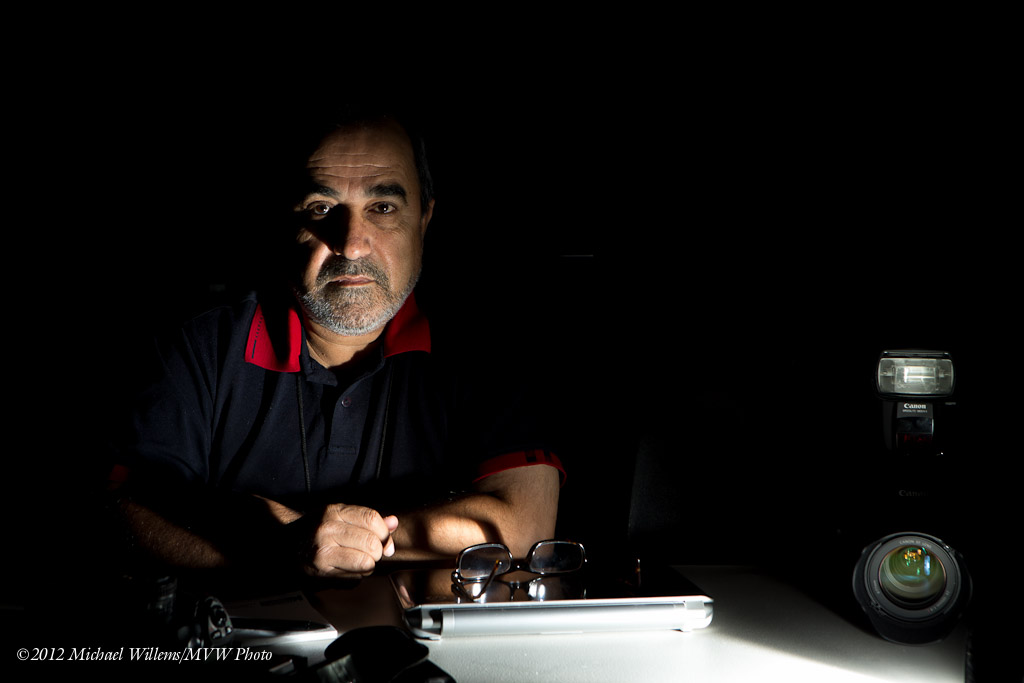 - This flash is on the table, on our right; with no modifiers at all, aimed straight at the subject’s face.