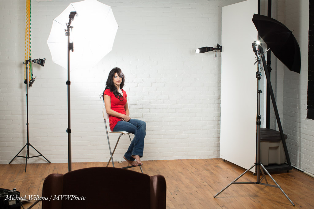 In indoor studio situations like the one pictured below, if I have strobes, I use Pocketwizards combined with “cell” sensors. Studio lights have light sensitive cells that detect a flash, and that fire when they see such a flash. So one studio light has a Pocketwizard; the others use their light sensitive cell.