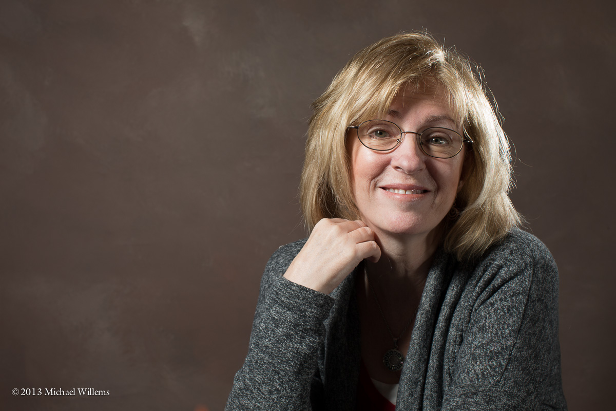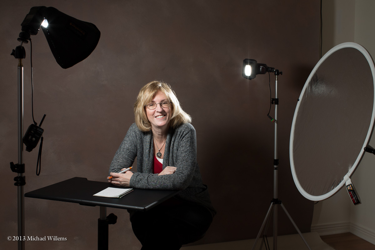 All this takes minutes to set up. A pro studio shot can often be done with simple equipment like this. And note the appropriate backdrop. The blond hair means we wanted a darker background. For dark hair I might have wanted a lighter backdrop: in that case I can add another light to light the backdrop I have.