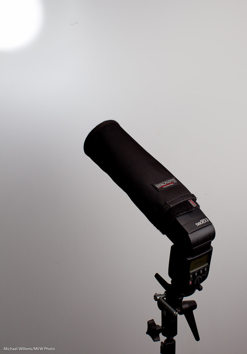 But attach its Velcro to a speedlight’s Speedstrap, and it becomes a convenient paddle that grabs the light, and nothing more or less, from the f;lash and bounces it forward.:
