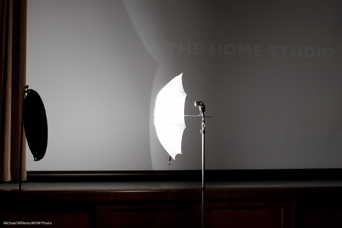 As an option, another flash with a small stand to light up backgrounds, but this is not a must have. You can just move the umbrella and subject closer to the wall if you want the wall to be lighter.
