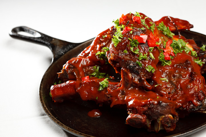 If you use flash, here’s what you need: a table, the food, a flash with an umbrella above the food, and a flash behind the food aiming at you, possibly with some kind of modifier too, to provide what in portraits I would call “shampooy goodness”, and in food “yummy goodness”. That is all (well – that and the camera).